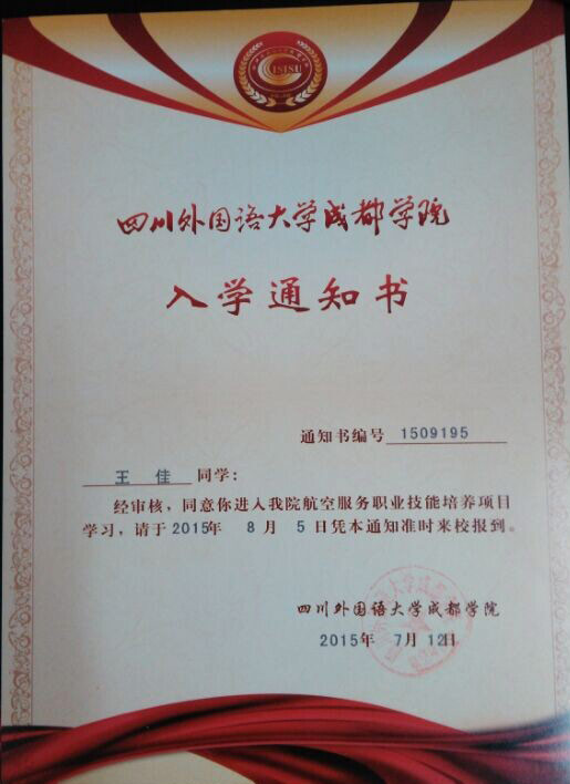 恭喜王佳同学被我校录取【川外成都航空】
